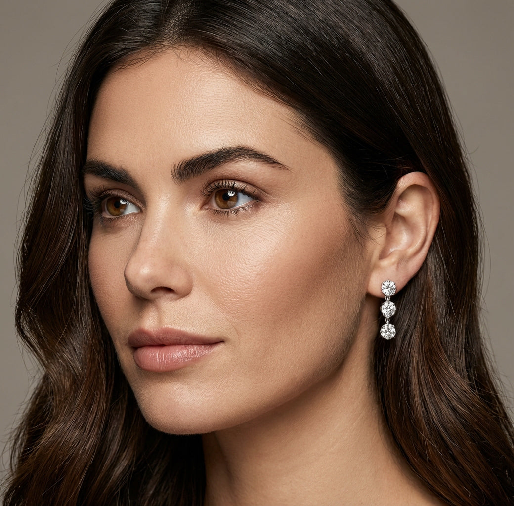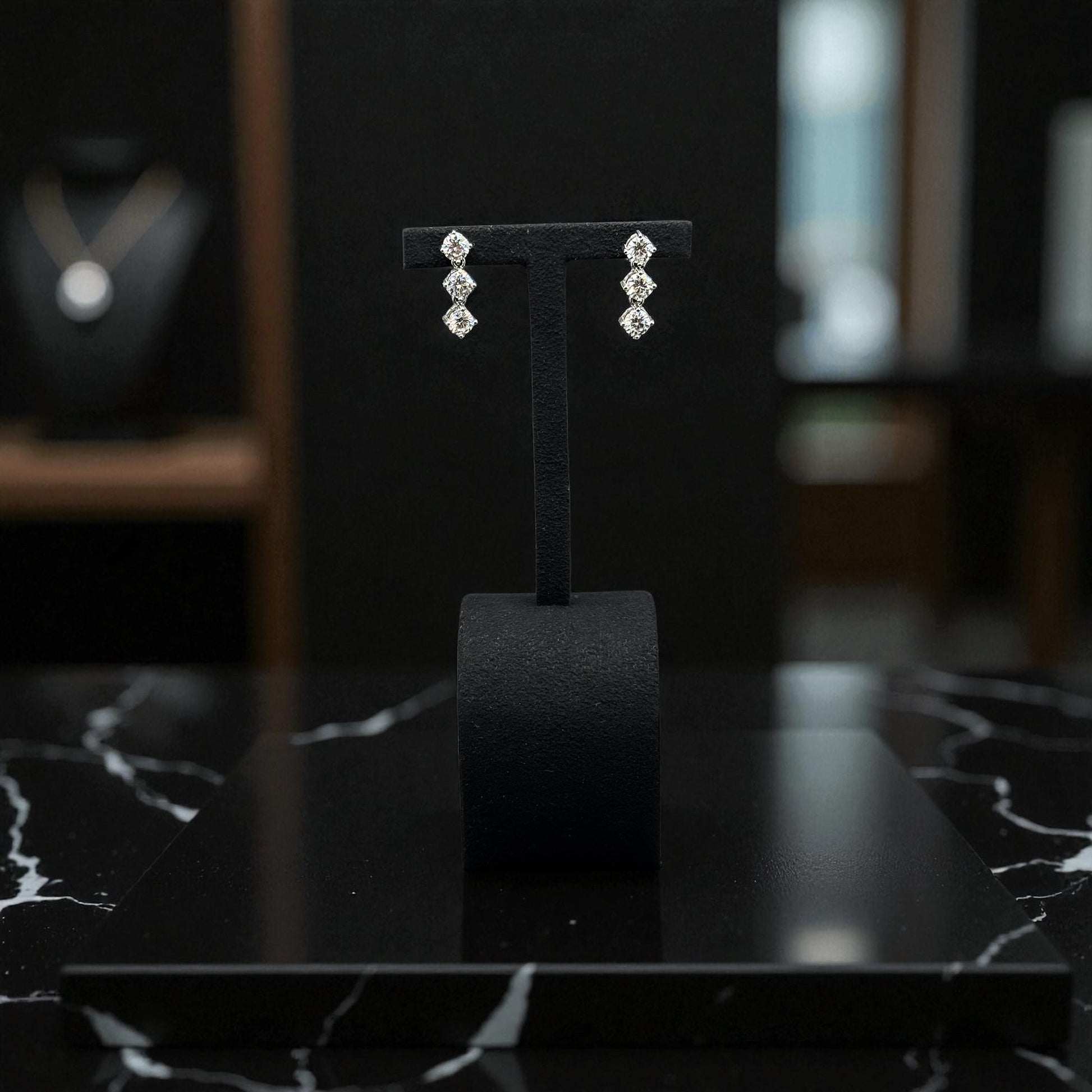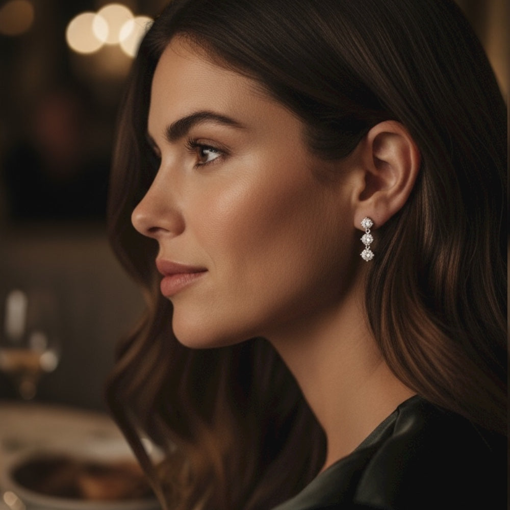 A shimmering symphony of light, these bezel trio drop earrings feature three stone arrangement of VVS1/D/Excellent round stones. Theses delicate four-prong settings in 14K white gold elevate each gem’s brilliance, creating a timeless piece that radiates refined elegance—perfect for every occasion.